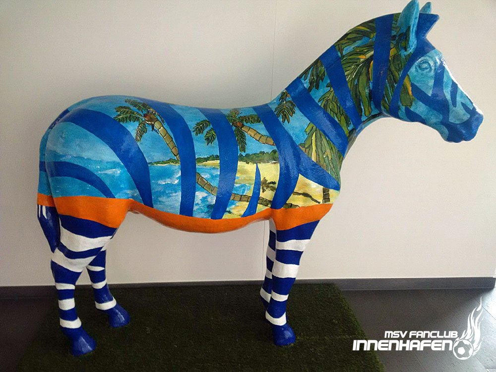 Malermeister Horst Münzberger hat seine Fassade mit dem MSV Zebra und der Silouette der Stadt Duisburg verschönert. Das Kunstwerk entstand 2013, kurz nach dem Zwangsabstieg des MSV. Es ist nicht nur beeindruckend groß (70 qm), es symbolisiert zudem auch die Werte unseres Fanclubs: "Für den MSV und Duisurg!"